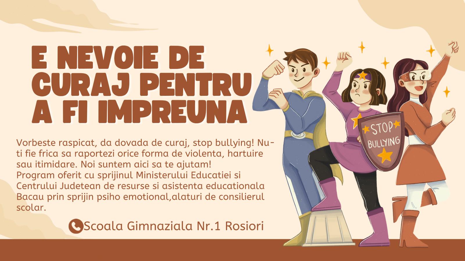 Pentru ca Şcoala Gimnazială Nr.1 Roşiori este preocupată de a avea un ambient liniştit, în care se promovează respectul, bunătate, acceptarea, toleranţa şi incluziunea, am câştigat un proiect pentru diminuarea fenomenului de bullying în şcoală, în colaborare cu Ministerul Educaţiei, " Împreună prindem curaj"! Prin activităţile propuse ne dorim să încurajăm un comportament empatic, să folosim cuvinte frumoase, să fim prieteni unii cu ceilalţi şi să ne înţelegem chiar dacă suntem diferiţi.